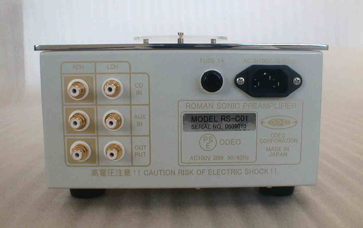 型式名:MODEL RS−C01/使用真空管:WE396Ax1(各社2C51、5670差し替え使用可能)/入力2系統/出力1系統/最大出力電圧:20V/ゲイン:12dB(約4.2倍)/周波数特性:10Hz〜80KHz(+0dB,−3.0dB)/高調波歪率:0.3%以下(1KHz,47kΩ負荷,1V出力時)/入力インピーダンス:50KΩ/出力インピーダンス:約1.7kΩ/残留雑音:0.1mV以下/電源電圧:AC100V,50Hz/60Hz//消費電力:30W/外形寸法(最大突起):幅210mm×高さ135mm×奥行き250mm/重量:4.2kg